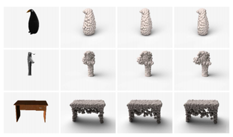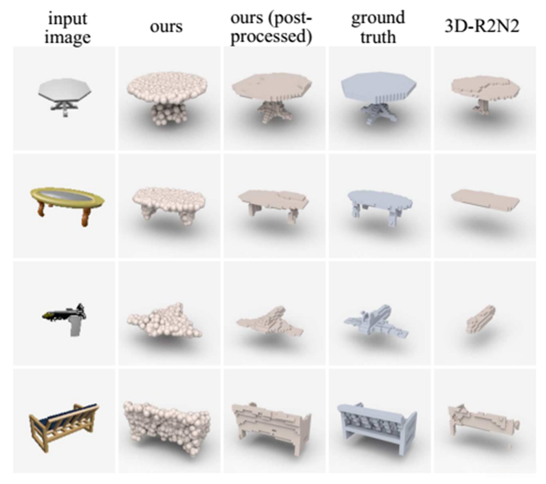 与我们的工作更相关的是[5]。给定一张图像,他们使用神经网络来预测潜在的3D物体作为3D体积。我们的工作与[5]之间有两个关键的区别:首先,[5]中的预测对象是一个3D体;而我们的是点云。如5.2节所展示和分析的,点集为神经网络形成了更好的形状空间,因此预测的形状更趋于完整和自然。其次,我们允许对单个输入图像进行多个重建候选。这个设计反映了一个事实,即一个单一的图像不能完全确定三维形状的重建。