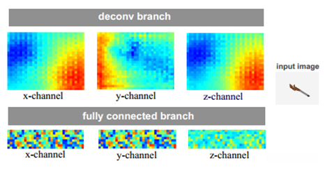 为了更好地理解这两个分支的功能,我们还分别对解旋分支和全连接分支的输出进行了可视化处理。图 9 是其中一个模型的 x、y 和 z 通道值的二维图像。在去卷积分支中,网络学会使用卷积结构来构建一个围绕物体旋转的二维曲面。在全连接分支中,由于通道没有排序,因此输出组织性较差。