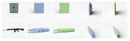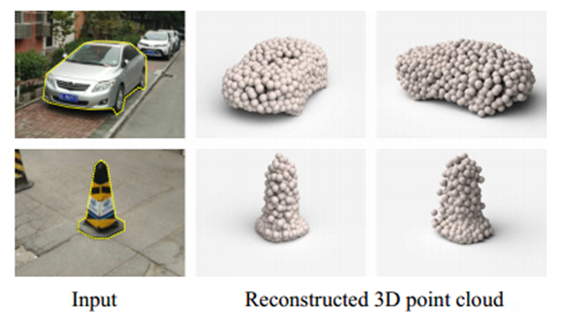 图1所示。从单幅图像可以重建完整物体的三维点云。每个点都被想象成一个小球体。重建在两个视点(沿方位角0◦和90◦)观看。分割掩码用于指示图像中对象的范围。