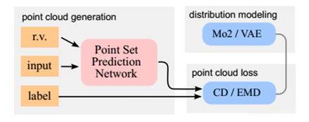 我们为点集构建条件生成网络的任务是具有挑战性的,这是由于无序的表示形式和基础真理固有的模糊性。这些挑战促使我们发明新的架构、损失函数和学习范式。具体来说,我们必须解决三个子问题: