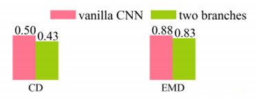 图 12. 通过倒角距离(CD)和地球移动距离(EMD)对不同网络进行比较。网络越复杂,结果越好