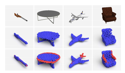 神经网络成功猜测出模型缺失的部分。通过使用对象库中嵌入的形状先验,系统可以利用对称性(例如飞机应该有对称的侧面)和功能性(拖拉机应该有轮子)的线索。点集的灵活表示有助于解决对象的一般形状和拓扑结构问题。直接利用局部几何线索的更细粒度的方法可以是在我们的预测之后进行级联,以丰富更高频率的细节。