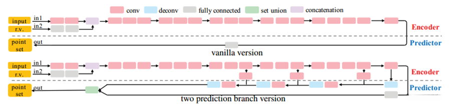 这个版本有两个并行的预测器分支-一个全连接(fc)分支和一个反卷积(deconv)分支。fc分支像以前一样预测N1个点。反卷积分支预测大小为H × W的3通道图像,其中每个像素处的三个值是一个点的坐标,给出另一个H × W点。他们的预测后来被合并在一起,形成m中的整个点集。多个跳跃链接被添加,以促进编码器和预测器之间的信息流。