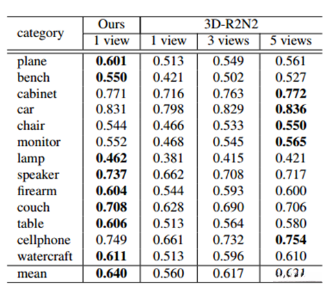 表 1. 三维重建比较(每个类别)。请注意,在单视图重建设置中,我们在所有类别中都获得了更高的 IoU。平均值是按类别计算的。在 13 个类别中的 8 个类别中,我们的结果甚至比给定 5 个视图的 3D-R2N2 更好。