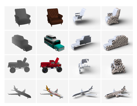 我们的方法有一个有趣的特点,那就是我们可以轻松地为系统注入额外的输入信息。当神经网络获得 RGBD 输入时,我们的系统就可以被看作是一种三维形状补全方法。图 7 展示了预测的实例。