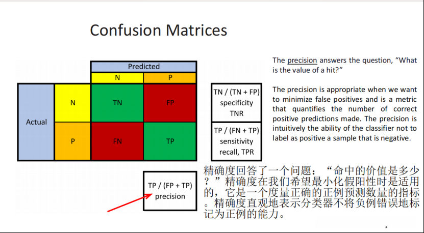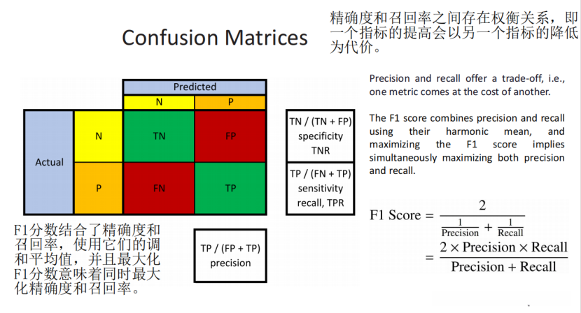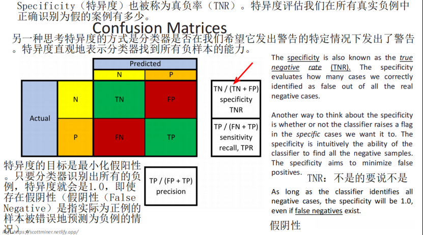 1. TNR: Specificity(特异度)也被称为真负率(TNR)。特异度评估我们在所有真实负例中正确识别为假的案例有多少。另一种思考特异度的方式是分类器是否在我们希望它发出警告的特定情况下发出了警告。特异度直观地表示分类器找到所有负样本的能力。特异度的目标是最小化假阳性。只要分类器识别出所有的负例,特异度就会是1.0,即使存在假阴性(假阴性(False Negative)是指实际为正例的样本被错误地预测为负例的情况)。 TF是预测的(真假),NP是本身是什么(负例正例真实是什么样的)