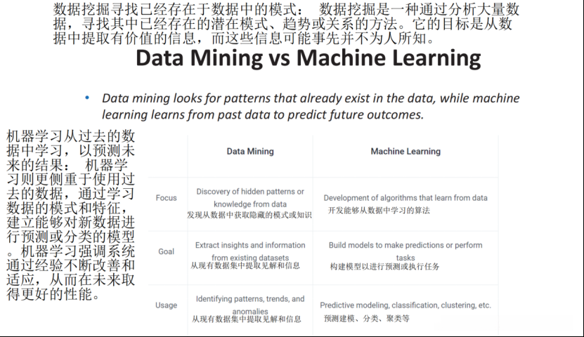 - Data Mining vs Machine Learning: Data mining looks for patterns that already exist in the data , while machine learning learns from past data to predict future outcomes.