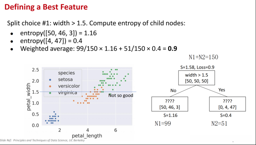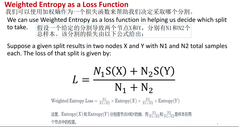 我们可以使用加权熵作为一个损失函数来帮助我们决定采取哪个分割(Defining a Best Feature)。使用刚刚那个熵可以计算出加权熵,分别对不同特征算加权熵,选择小的那个更好。