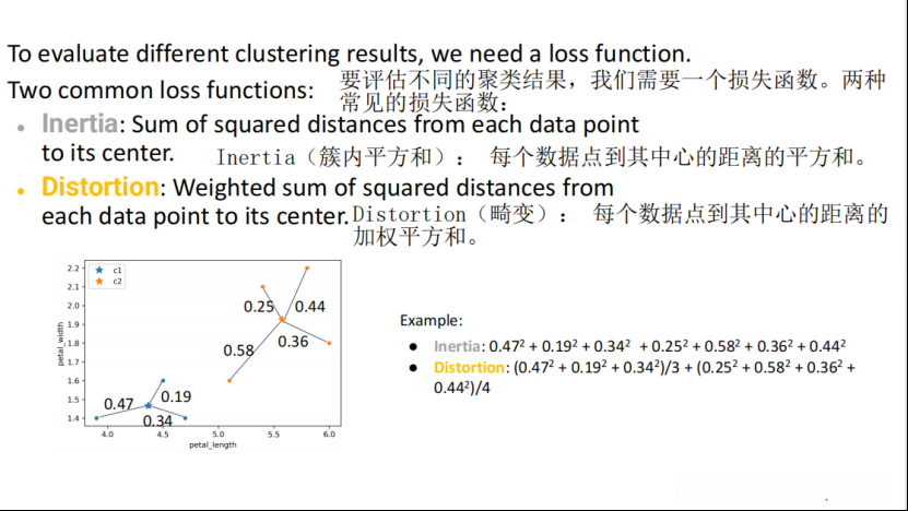 * Distortion(畸变): Weighted sum of squared distances from each data point to its center越小越好
