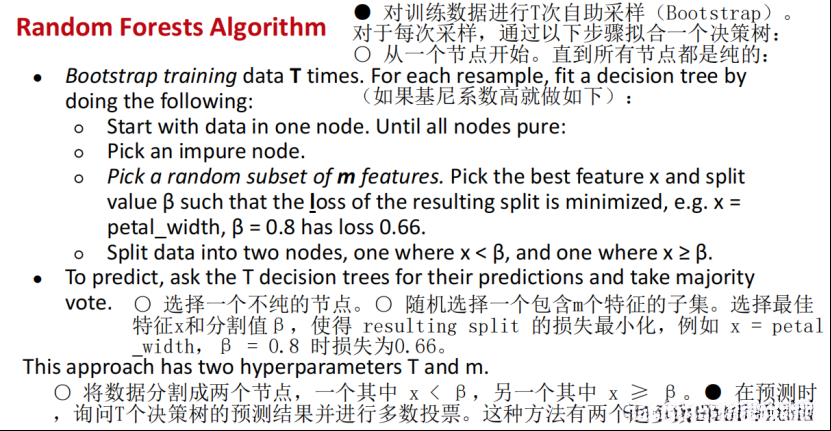 2. 只有一个训练集,如何使用一个训练集构建多棵树:Bagging(Bootstrap AGGregatING),基本流程如下:- 给定包含m 个样本的数据集,我们先随机取出一个样本放入采样集中,再把该样本放回初始数据集,使得下次采样时该样本仍有可能被选中,这样,经过m次随机采样操作,我们得到含m 个样本的采样集,初始训练集中有的样本在采样集里多次出现,有的则从未出现,初始训练集中约有63.2%的样本出现在来样集中.