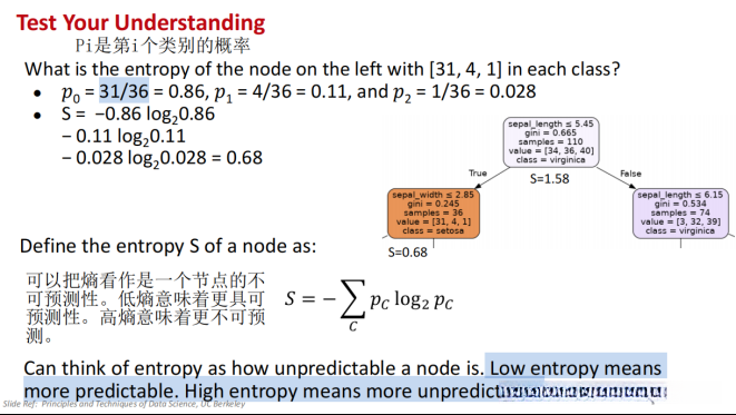 * 选择最佳的特征和分割值是关键的决策:等价于在图上画水平线和垂直线Low entropy means more predictable. High entropy means more unpredictable
