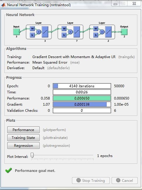 非常便捷地可以直接使用神经网络工具箱,在GUI界面中进行参数配置:输入数据、目标输出、优化算法以及训练轮数。