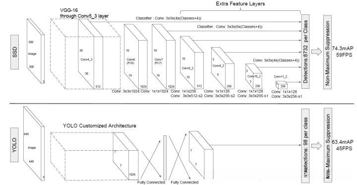 SSD网络结构如图1所示:可以看到新增加的特征图大小逐渐减小,而且每个特征图的每个卷积核是相互独立的。