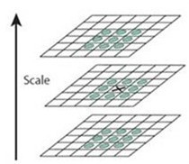 X标记当前像素点,绿色的圈标记邻接像素点,用这个方式,最多检测26个像素点。X被标记为特征点,如果它是所有邻接像素点的最大值或最小值点。