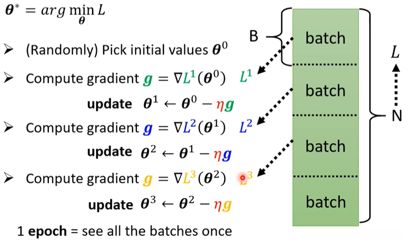 假设我们有N个资料,我们并不是用所有的资料来算出一个L,然后再算gradient,然后再更新θ。而是将全部N个资料,将每B个为一组(自己设置,也是一个hyper parameter),称为一个batch,给定一个θ0后,用一个batch来算出一个L1,然后在算出gradient,来更新参数得到θ1。然后使用θ1在下一组batch上计算L2,然后计算gradient,然后更新参数得到θ2,然后重复下去。