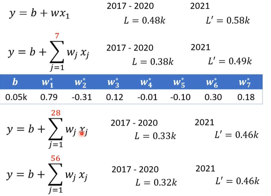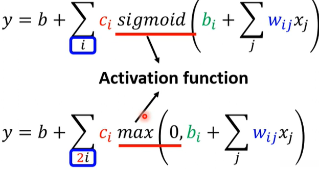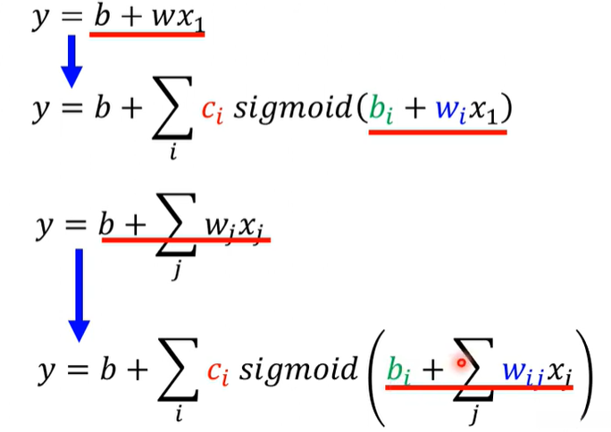 然后就像之前linear model一样,考虑之前更多天的影响,将函数增加了更多的features,现在函数复杂了之后仍然可以考虑前几天的影响,即增加more features。其中的wij代表在组成“红线”的第i个“蓝线”函数上的前第j天的影响参数。最后得到了增加参数的function,如下图: