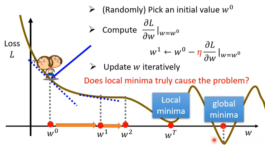 然后不断更新,当机器达到w更新次数时停止,此次数由自己设置,也是超参数;或者找到了最好的w值停止。但是此种方法会有找到了Local minima而非是global minima的问题。