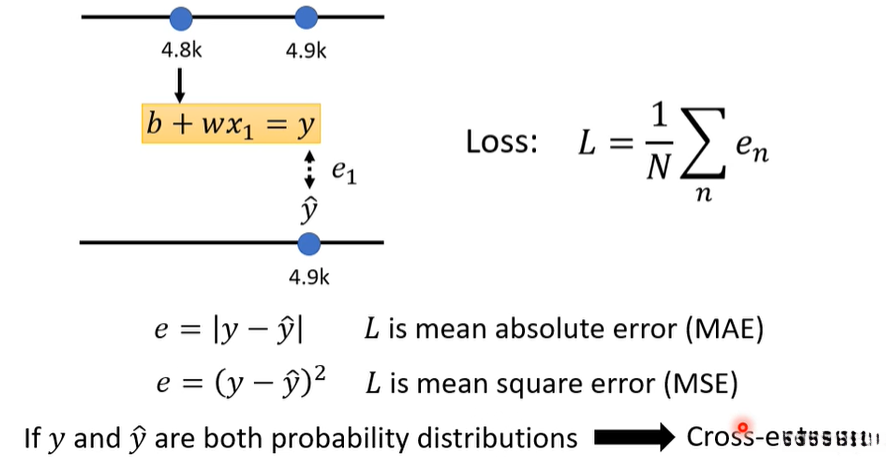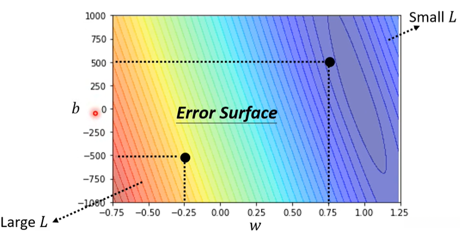 Loss is a function of parameters,Loss也是也个函数,其输入是model里的参数b和w,即L(b,w)。其输出的是给b和w一组数值时,判定这组数值是好还是不好。