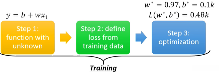 写出一个带有未知参数(parameter)的函数f,即先猜测函数可能是什么样子,基于我们对此任务本质的了解-based on domain knowledge。举例:y=b+wx:y是要预测的东西,x是已经知道的信息-feature,w-weight和b-bias是未知的、要通过资料找出来的