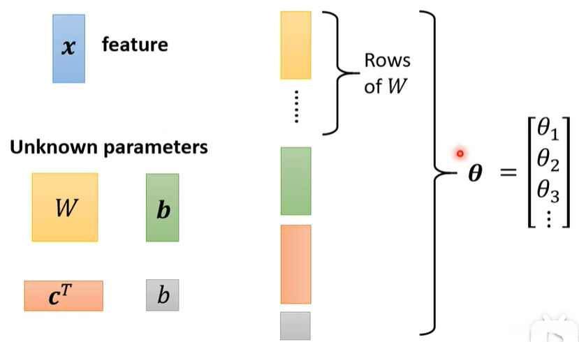 其中的x是feature是已知的,而常数b、向量b、w、c转置都是未知的参数,然后把所有未知矩阵的一行或者一列都放在一起,组成θ矩阵,一律统称θ(如下图),然后至此就完成了机器学习框架的第一步:定义一个含有未知参数的方程