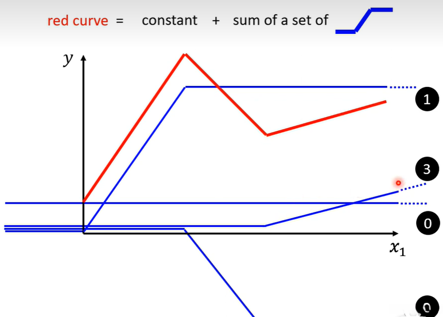 两个ReLU相加可以得到Sigmoid,两个ReLU右侧斜率相反,相加正好为一个常数,左侧都是零,相加正好是SIgmoid函数。