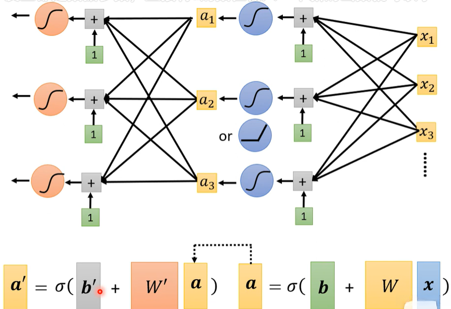 本来是(b+wx)通过θ函数得到a矩阵,现在也可以通过ReLU函数,然后这个过程可以反复的多做几次,通过下图方便看出,把a看作开始的x,再与w'相乘加b'(与前一个过程的w和b不是同一个参数,是另外的参数),再通过sigmoid函数或者ReLU函数,可以反复多次,至于多少次可以自行决定,又是一个hyperparameter。