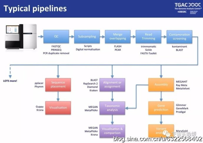 图2. 宏基因组数据处理的基本流程和需用软件(有具体操作需求的同学可以通过下面网址下载英文相关教程https://github.com/TGAC/361Division/tree/master/Metagenomics 2015)