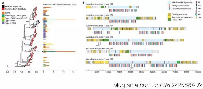 以Crits-Christoph和Diamond等人2018年6月发表于Nature的文章为例。研究人员用宏基因组测序的方式,从草地土壤样本中获得了376株细菌基因组,的基因组序列,发现了完全新颖的生物合成基因簇,并描述了它们的基因组学、系统发育学和生态学状况。他们共鉴定出了1599个生物合成基因簇(biosynthetic gene clusters),推测这些基因簇可能合成非核糖体多肽、聚酮化合物等,很多非核糖体多肽合成酶(NPRS)和聚酮合成酶(PKS)都能够合成抗生素、抗真菌素、嗜铁素或免疫抑制剂,所以该研究中着重关注这两类基因簇(图4),以期发现新的抗生素和药用化合物。