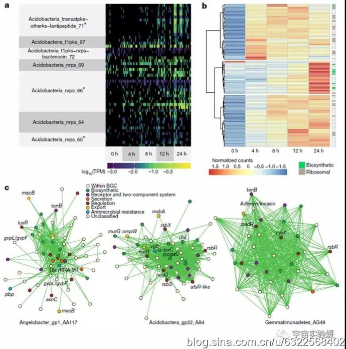 图7. 生物合成基因的宏转录组。在添加了底物后12-24h,Candidatus Angelobacter基因组中几个基因簇的基因表达水平显著升高(7a),并且一些生物合成基因的表达与核心核糖体基因的表达不一致(7b)。表明Candidatus Angelobacter能够对水和基质的添加产生响应,并且在核心代谢基因的表达量上升数小时后单独调控次级代谢产物合成相关基因的表达。从基因共表达模型来看,7个基因组中有4个发生了显著的次级代谢基因共表达富集(p<0.05)(7c)。