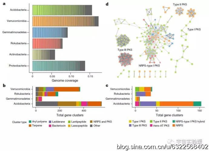 图4. 样本中提取到的基因组和其生物合成基因簇的情况差异展示。a,几个菌门的平均相对丰度。b,生物合成基因簇在几个菌门之间的分布,不同颜色代表由antiSMASH(用于生物合成基因簇的分析;http://antismash.secondarymetabolites.org)推测的产物类型c,研究鉴定到了240个NRPS、PKS(根据酶结构域的组成差异分为型、型和型)和NRPS-PKS混合型基因簇,以及86个可能不完整的基因簇。尽管这些基因含量水平各异,但是由于这些酶具有保守的结构域,因此他们的生物合成途径是可识辨的。d,生物合成基因簇的网络图,连线代表两端具有共有基因,共有基因所占比例越大连线越粗、颜色越深。由该图可知,Verrucomicrobia、Acidobacteria和Rokubacteria中存在不同且稀疏的NRPS和PKS系统,而多数稀有型NRPS基因簇之间的距离较为疏远。在Rokubacteria和Acidobacteria的一支中保守的型PKS基因簇形成了一个密集的网络集群,高度的保守性可能意味着一类新的代谢物的广泛分布。