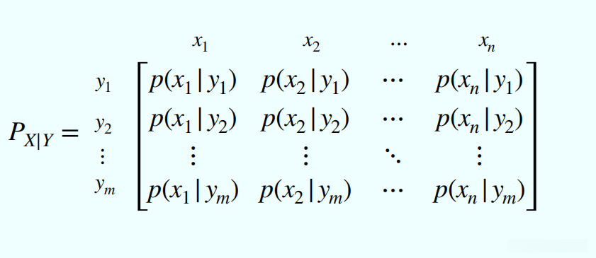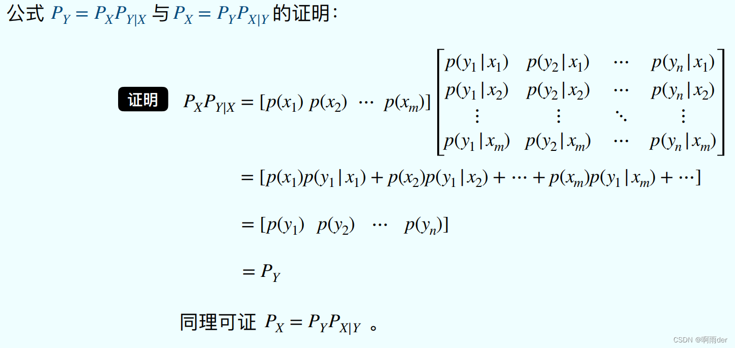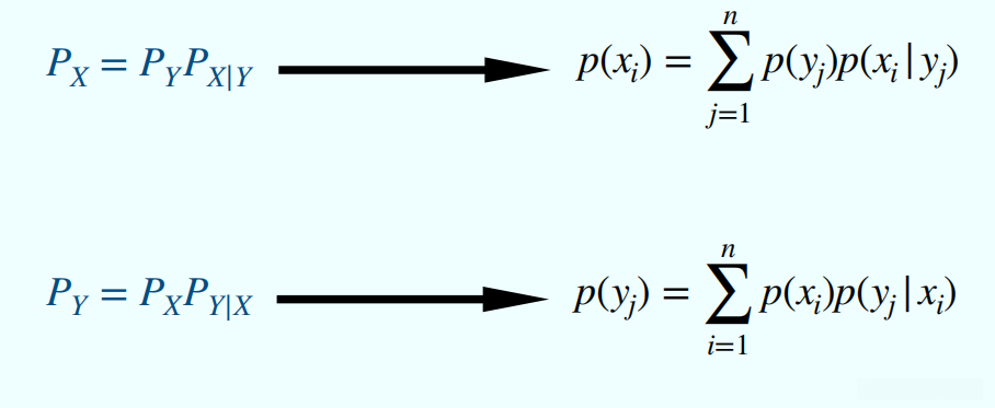 用矩阵的形式,可表示为 Py = Px P y |x ,同理可推得 Px = Py P x |y 。