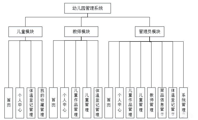系统架构图属于系统设计阶段,系统架构图只是这个阶段一个产物,系统的总体架构决定了整个系统的模式,是系统的基础。幼儿园管理系统的整体结构设计如图4-2所示。