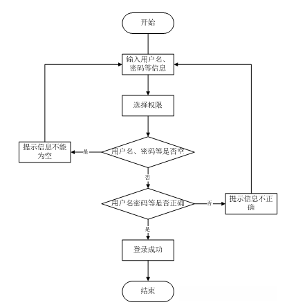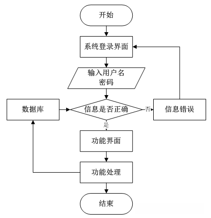 用户打开并进入系统后,会先显示登录界面,输入正确的用户名和密码,系统自动检测信息,若信息无误,则用户会进入系统功能界面,进行操作,否则会提示错误无法登录,操作流程如图3-3所示。