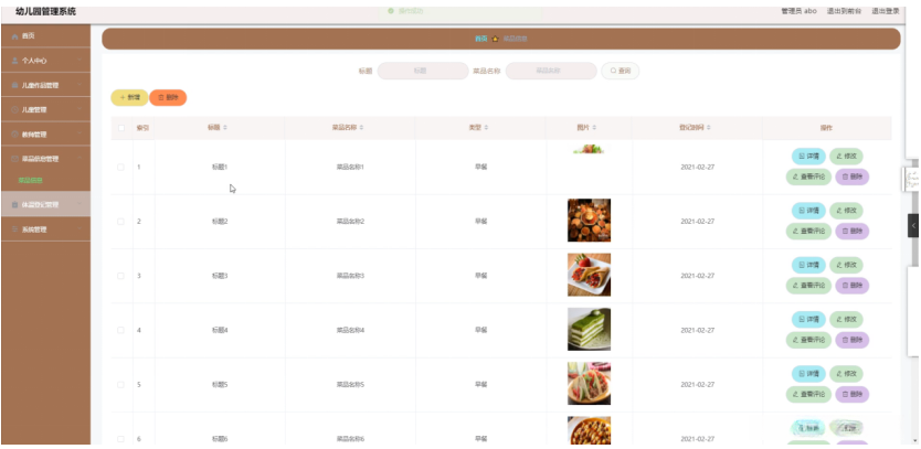 管理员登录进入幼儿园管理系统可以查看首页、个人中心、儿童作品管理、儿童管理、教师管理、菜品信息管理、体温登记管理、系统管理等信息,如图5-7所示。
