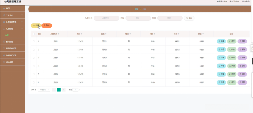 儿童管理,在儿童管理页面中可以查看索引、儿童姓名、密码、班级、性别、年龄、身高、体重等信息,并可根据需要进行修改或删除操作,如图5-9所示。