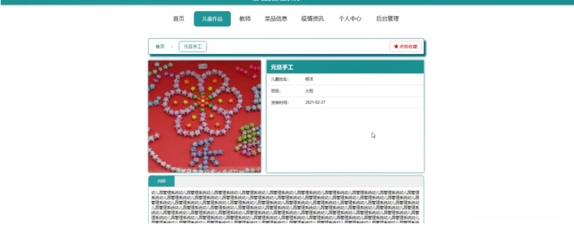 儿童作品,在儿童作品页面可以查看标题、儿童姓名、班级、图片、发表时间、内容等信息,进行收藏,如图5-2所示。