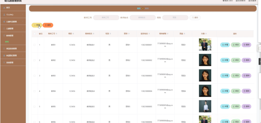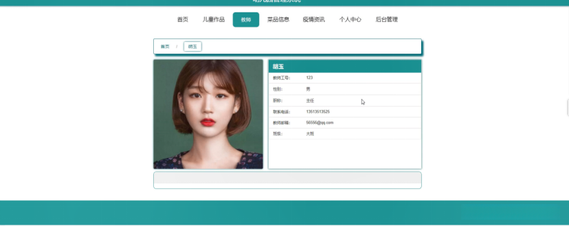教师,在教师页面可以查看教师姓名、教师工号、性别、图片、职称、联系电话、教师邮箱、班级等信息,如图5-3所示。
