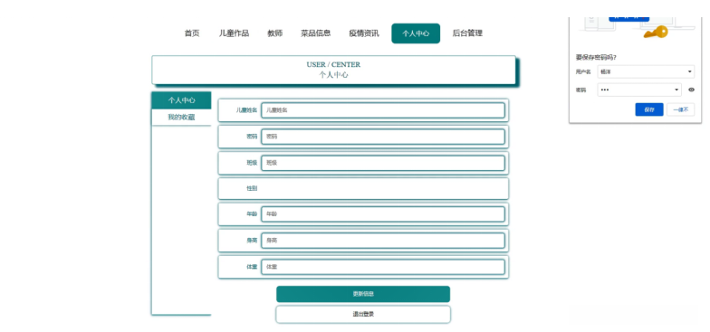 个人中心,在个人中心页面通过填写儿童姓名、密码、班级、性别、年龄、身高、体重等信息进行更新,如图5-5所示。