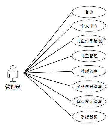 系统中的核心用户是系统管理员,管理员登录后,通过管理员菜单来管理后台系统。主要功能有:首页、个人中心、儿童作品管理、儿童管理、教师管理、菜品信息管理、体温登记管理、系统管理等功能。管理员用例如图3-7所示。