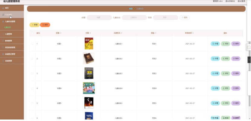 儿童作品管理,在儿童作品管理页面中可以查看索引、标题、封面、儿童姓名、班级、发表时间等信息,并可根据需要对进行修改或删除等操作,如图5-8所示。