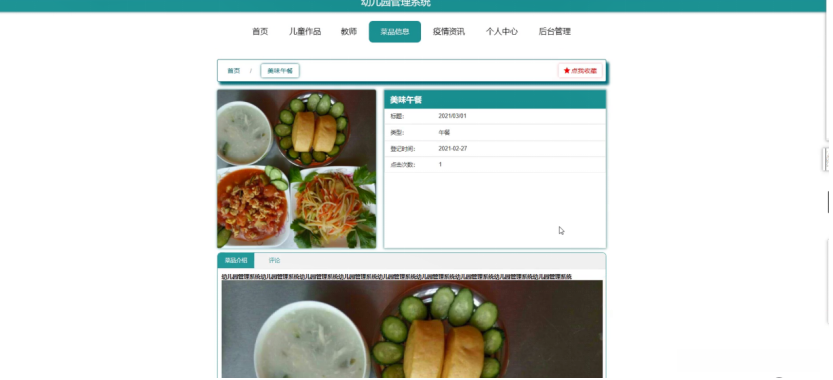 菜品信息,在菜品信息页面可以查看菜品名称、标题、类型、图片、登记时间、点击次数、菜品介绍等信息,进行评论或收藏,如图5-4所示。
