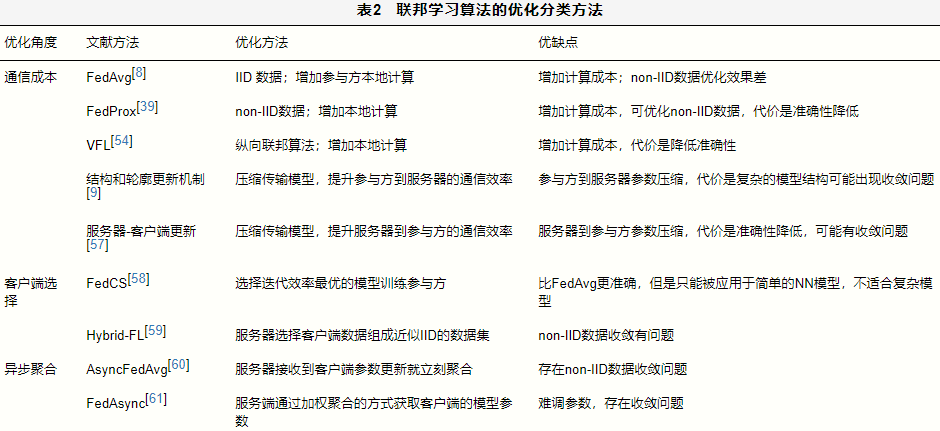 联邦学习算法的优化分类方法见表2。