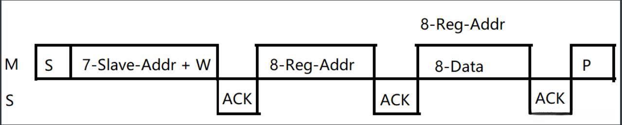 主机发起起始信号开始,主机发送7位从机地址加写位,从机接收到信号发送ACK应答,主机收到应答再发送8位寄存器地址,从机收到信号再发送ACK应答,主机收到应答信号发送8位数据位,从机再发送ACK,主机发送终止信号。