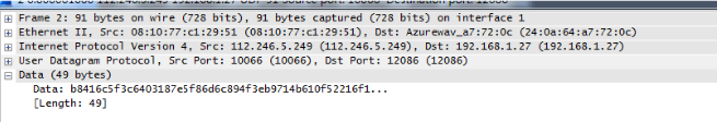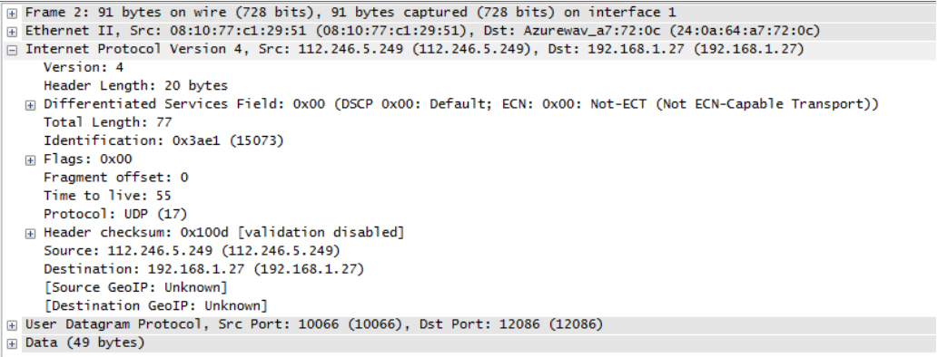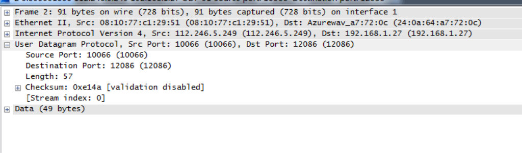 User Datagram Protocol 可以观察 User Datagram Protocol 的内容,显示了源端口号,还有目的端口号,以及 UDP 协议的长度,和包头检验和的结果(checksum)。
