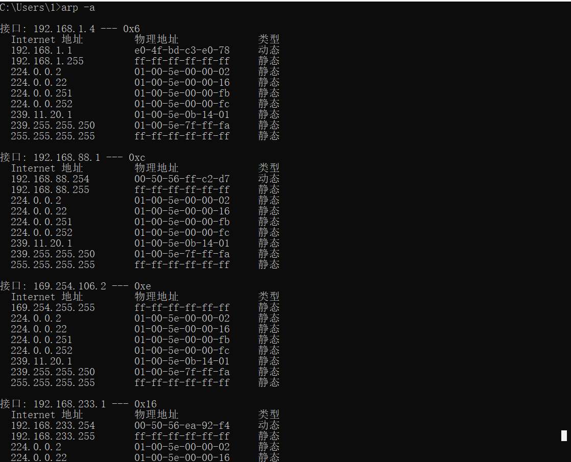 执行指令arp -a,如下图所示。
