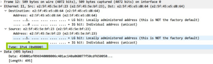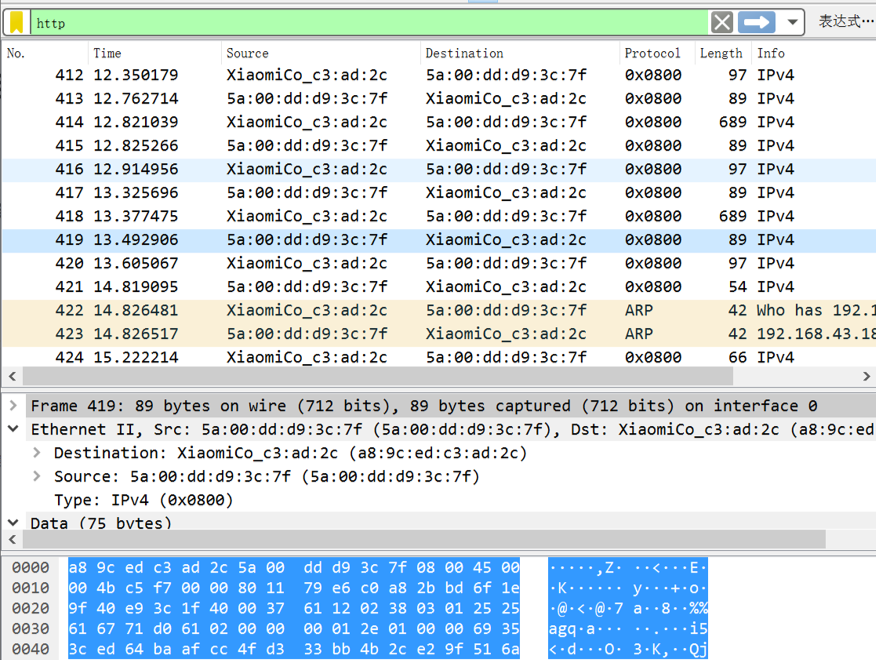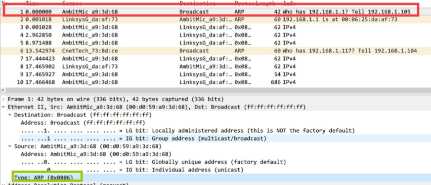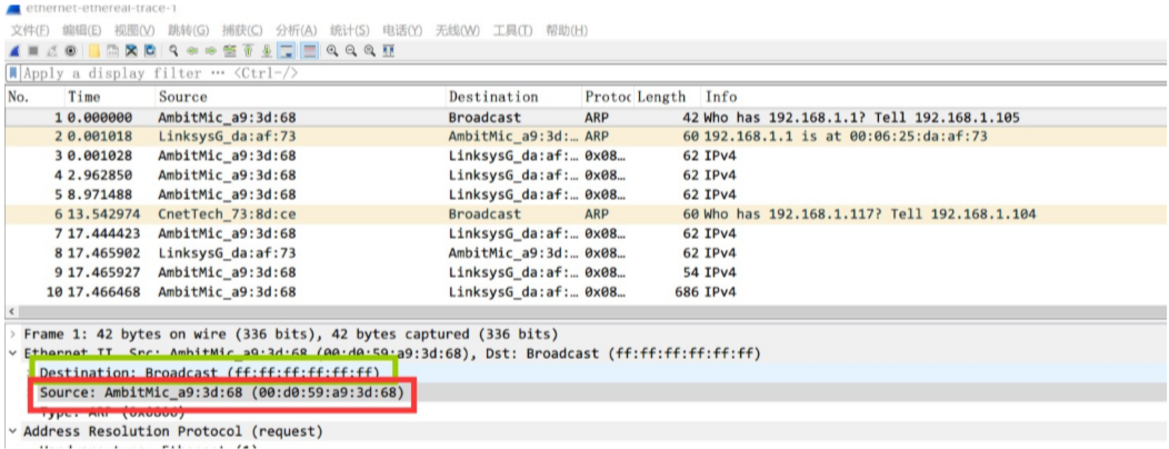 展开 Etnernet 的头部,我们可以看到包含 ARP 请求消息的以太网帧中源地址和目标地址的十六进制: