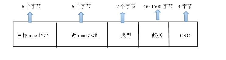 报头: 8 个字节,前 7 个 0,1 交替的字节(10101010)用来同步接收站,一个1010101011字节指出帧的开始位置。报头提供接收器同步和帧定界服务。 目标地址: 6 个字节,单播、多播或者广播。单播地址也叫个人、物理、硬件或 MAC 地址。广播地址全为 1 , 0xFF FF FF FF。 源地址: 6 个字节。指出发送节点的单点广播地址。 以太类型: 2 个字节,用来指出以太网帧内所含的上层协议。即帧格式的协议标识符。对于 IP 报文来说,该字段值是0x0800。对于 ARP 信息来说,以太类型字段的值是0x0806。 有效负载:由一个上层协议的协议数据单元 PDU 构成。可以发送的最大有效负载是 1500 字节。由于以太网的冲突检测特性,有效负载至少是 46 个字节。如果上层协议数据单元长度少于 46 个字节,必须增补到 46 个字节。 帧检验序列:4 个字节。验证比特完整性。