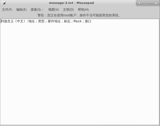 双击打开桌面上的工作区文件夹workspace,再打开实训文件夹myshixun,并打开其中的文件message-3.txt,将查询的信息保存到文件message-3.txt。具体要求如下: (1)在桌面空白处右击,打开终端,输入arp命令; (2)查看计算机 ARP 缓存的内容,每个列值的含义是什么?(用分号”;”隔开)写入文件中; (3)保存文件并使用 git 将文件 message-3.txt 推送到远程仓库,此步骤不影响评测。