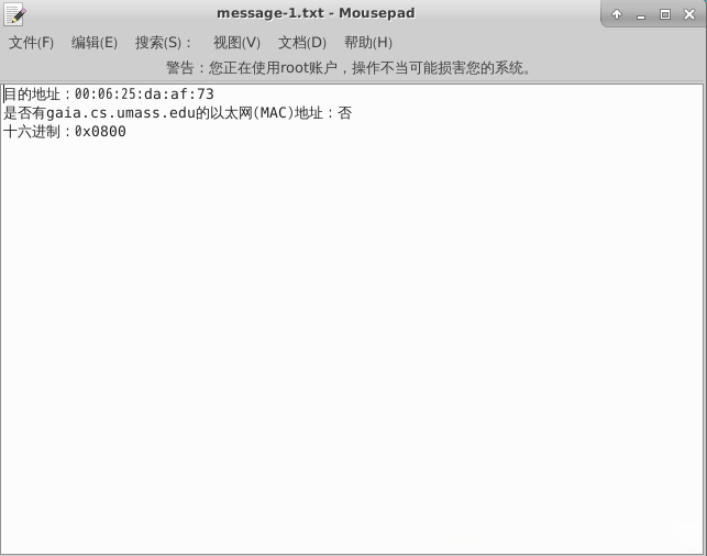 双击打开桌面上的工作区文件夹workspace,再打开实训文件夹myshixun,并打开其中的文件message-1.txt,将查询的信息保存到文件message-1.txt。具体要求如下: (1)打开 Wireshark,加载实训文件夹中的ethernet-ethereal-trace-1文件,进行分析; (2)根据包含 HTTP GET 消息的以太网帧进行分析:以太网帧中 48 位目的地址是什么?填写到文件中; (3)打开左上角的terminal emulator窗口,通过ping gaia.cs.umass.edu命令查看gaia.cs.umass.edu的IP地址,在终端命令中输入查看arp命令:arp 查看是否有gaia.cs.umass.edu的MAC地址,如果有,将其MAC地址填写到文件中,如果没有,填写“否”到文件中; (4)Ethernet II 两字节的帧类型字段的十六进制值,填写到文件中; (5)保存文件并使用 git 将文件 message-1.txt 推送到远程仓库,此步骤不影响评测。