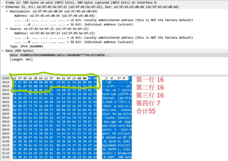 计算字节: 例如计算从以太帧的开始,一直到“GET”中的 ASCII G出现在以太网帧中为止,有 55 Byte(此时第一个字节为 1)。图中每两个十六进制字符代表一个字节(8 比特),FF = 11111111(2) = 8 Bit = 1 Byte。